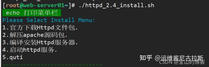 # echo 打印httpd-2.4安装步骤 [root@web-server01~]# touch httpd_2.4_install.sh # 赋予执行权限 [root@web-server01~]# chmod o+x httpd_2.4_install.sh [root@web-server01~]# ./httpd_2.4_install.sh