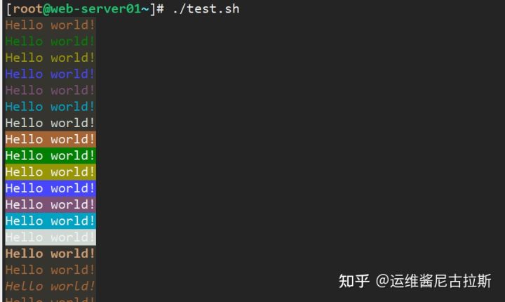echo -e "\033[$i;31;40mHello world!\033[0m"