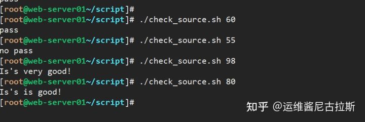 # if 语句可以直接对命令状态进行判断,就省去了获取$?这一步! # 如果第一个条件符合就不再向下匹配 #!/bin/bash # this check grade shell # by author rivers on 2021-09-27 grade=$1 if [ $grade -gt 90 ];then echo "Is's very good!" elif [ $grade -gt 70 ];then echo "Is's is good!" elif [ $grade -ge 60 ];then echo "pass" else echo "no pass" fi