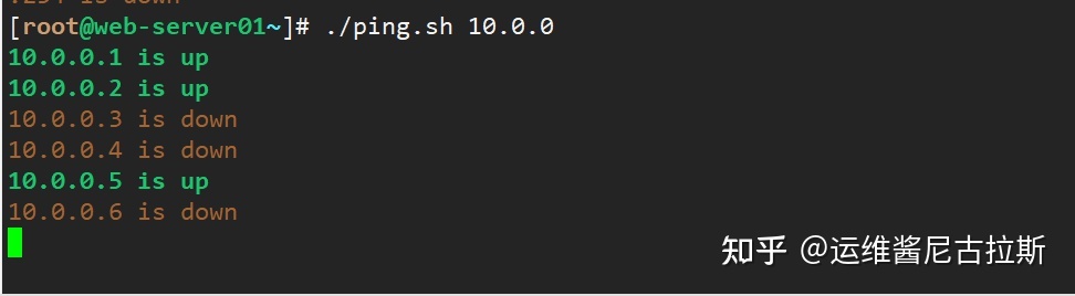 #!/bin/bash # check hosts is on/Off # by rivers on 20219-23 Network=$1 for Host in $(seq 1 254) do ping -c 1 $Network.$Host > /dev/null && result=0 || result=1 if [ "$result" == 0 ];then echo -e "\033[32;1m$Network.$Host is up \033[0m" echo "$Network.$Host" >> /tmp/up.txt else echo -e "\033[;31m$Network.$Host is down \033[0m" echo "$Network.$Host" >> /tmp/down.txt fi done