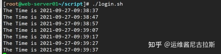 [root@web-server01~/script]# vim login.sh #!/bin/bash #Check File to change. #By author rivers 2021-9-27 USERS="hbs" while true do echo "The Time is `date +%F-%T`" sleep 10 NUM=`who|grep "$USERS"|wc -l` if [[ $NUM -ge 1 ]];then echo "The $USERS is login in system." fi done