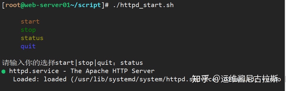 [root@web-server01~/script]# vim httpd_start.sh # check http server start|stop|starus # by author rivers on 2021-9-27 while true do echo -e " \033[31m start \033[0m \033[32m stop \033[0m \033[33m status \033[0m \033[34m quit \033[0m " read -p "请输入你的选择start|stop|quit:" char case $char in start) systemctl start httpd && echo "httpd服务已经开启" || echo "开启失败" ;; stop) systemctl stop httpd && echo "httpd服务已经关闭" || echo "关闭失败" ;; restart) systemctl restart httpd && echo "httpd服务已经重启" || echo "重启失败 " ;; status) systemctl status httpd && echo -e " httpd 的服务状态 ;; quit)