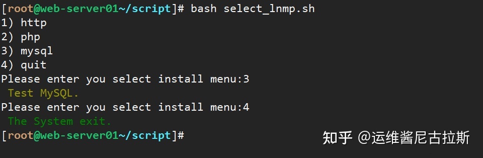 #!/bin/bash #by author rivers on 2021-9-27 PS3="Please enter you select install menu:" select i in http php mysql quit do case $i in http) echo -e " \033[31m Test Httpd \033[0m" ;; php) echo -e "\033[32m Test PHP\033[0m" ;; mysql) echo -e "\033[33m Test MySQL.\033[0m" ;; quit) echo -e "\033[32m The System exit.\033[0m" exit esac done
