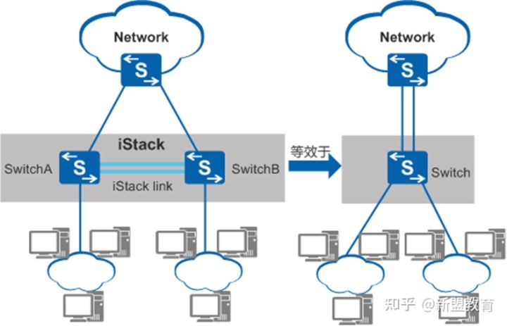 堆叠iStack(Intelligent Stack),是指将多台支持堆叠特性的交换机设备组合在一起,从逻辑上组合成一台交换设备。如上图1所示,SwitchA与SwitchB通过堆叠线缆连接后组成堆叠iStack,对于上游和下游设备来说,它们就相当于一台交换机Switch。