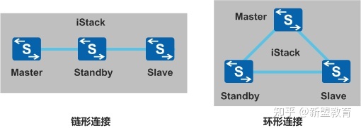 | 链形连接 | 首尾不需要有物理连接,适合长距离堆叠。 | 可靠性低:其中一条堆叠链路出现故障,就会造成堆叠分裂。堆叠链路带宽利用率低:整个堆叠系统只有一条路径。 | 堆叠成员交换机距离较远时,组建环形连接比较困难,可以使用链形连接。 |