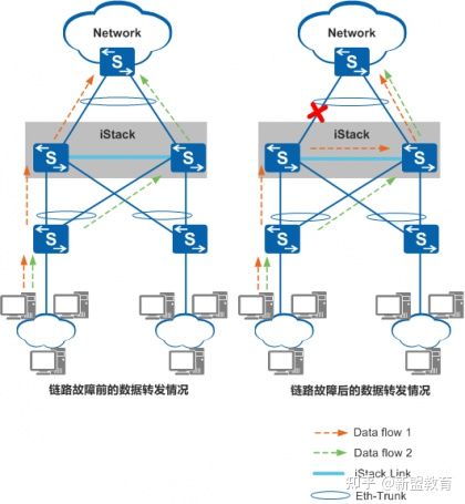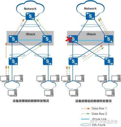 当其中一条聚合链路故障或堆叠中某台成员交换机故障时,Eth-Trunk接口能够将流量重新分布到其他聚合链路上,实现了链路间和设备间的备份,保证了数据流量的可靠传输。