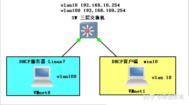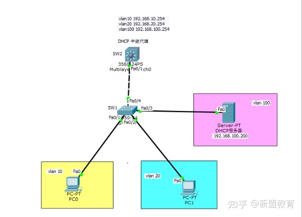 以上两种实验环境,原理都是相同的,中继原理就是让DHCP服务器与客户机要实现通信,才能获取到地址。要实现跨vlan获取IP地址,需要通过路由功能,使各主机间都能实现跨vlan通信,在去设置DHCP中继服务。