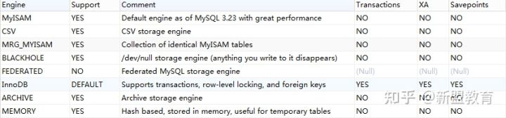 Support列的值表示某种引擎是否能使用:YES表示可以使用、NO表示不能使用、DEFAULT表示该引擎为当前默认的存储引擎 。