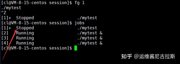 使用fg命令(foreground),可以将某个作业提至前台运行,如果该作业正在后台运行则直接提至前台运行,如果该作业处于停止状态,则给进程组的每个进程发SIGCONT信号使它继续运行并提至前台。