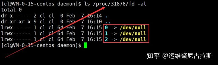 通过ls /proc/进程id/fd -al命令,可以看到该进程的标准输入、标准输出以及标准错误也成功重定向到了/dev/null。