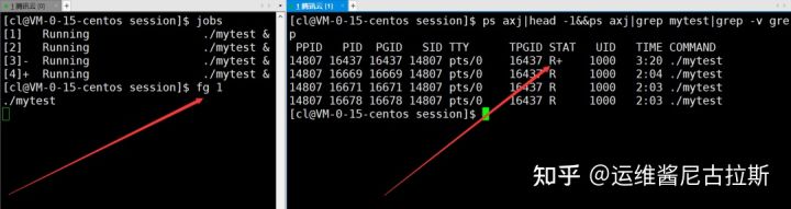 由于1号作业被提至前台运行,所以其运行状态也由R变成了R+。