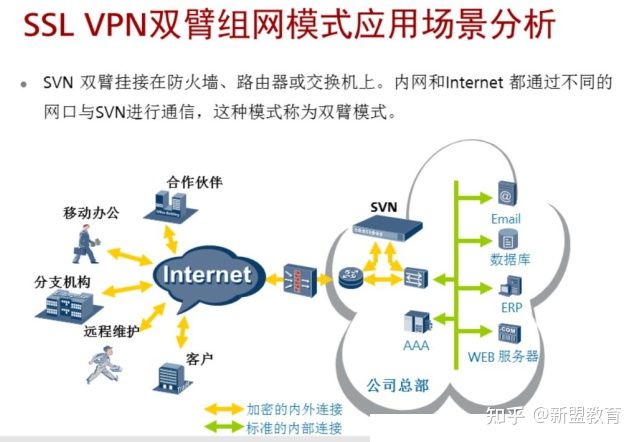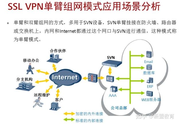 图中路由器和交换机之间处于连接状态。这是因为客户网络中可能有部分应用不需要经过SSL加密,而是直接通过防火墙访问外网。这时就需要在交换机和路由器.上配置策略路由,需要建立SSLVPN的流量就转发到SVN上,而普通的应用就直接通过防火墙访问外网。