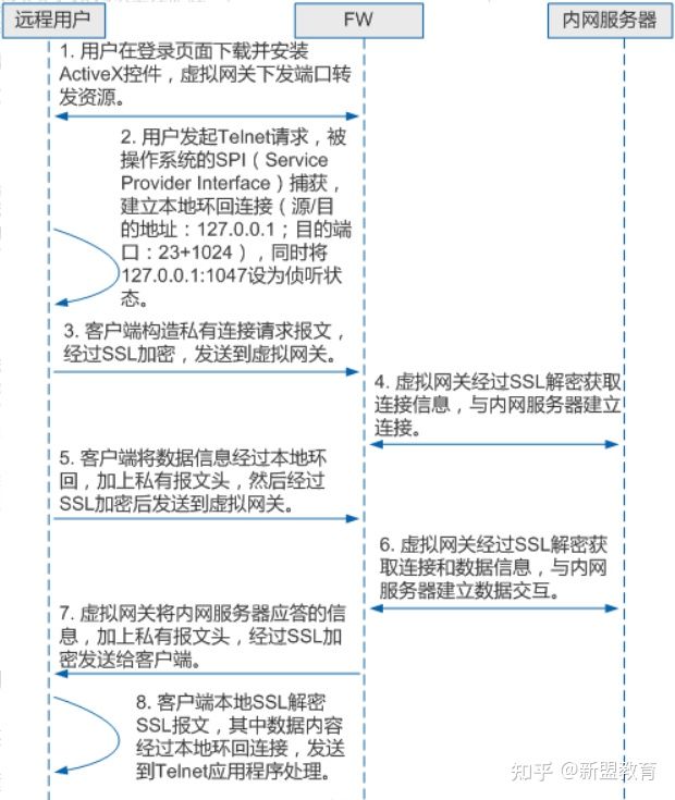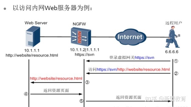 从业务交互流程可以看出,Web代理功能的基本实现原理是将远程用户访问Web Server的过程被分成了两个阶段。首先是远程用户与NGFW虛拟网关之间建立HTTPS会话,然后NGFW虚拟网关再与Web Server建立HTTP会话。虚拟网关在远程用户访问企业内网Web Server中起到了改写、转发Web请求的作用。