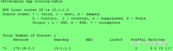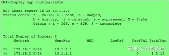 172.16.1.0/24和172.16.2.0/24这两条路由已经被进入BGP路由表,并发送到R4。两条路由的AS_PATH均为“3 2 1”。这里,R4知道,要到达这两个目的地,需要经过AS3、AS2再经过AS1才能到达。所以这里就是有序的AS_PATH,也就是这里的AS_PATH类型是AS_SEQENCE。