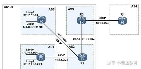 下面我们再把这个例子变动一下,把AS1、AS2、AS3、AS5都作为子AS加入到BGP联盟中,联盟AS号为100。如下图: