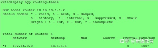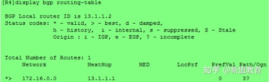 在R3上配置命令:aggregate 172.16.0.0 16 detail-suppressed。这里detail-suppressed关键字代表R3只会向R4发送聚合路由。在R4上查看BGP路由表可以发现: