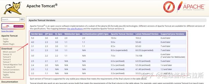 选择版本:点击左边Download下的which version,根据Supported Java Versions来选择合适的Tomcat版本。