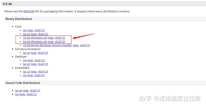 下载软件:点击左边Download下的具体版本,如:Tomcat 9。滑动至页面底部,在Core区域根据windows版本进行选择。