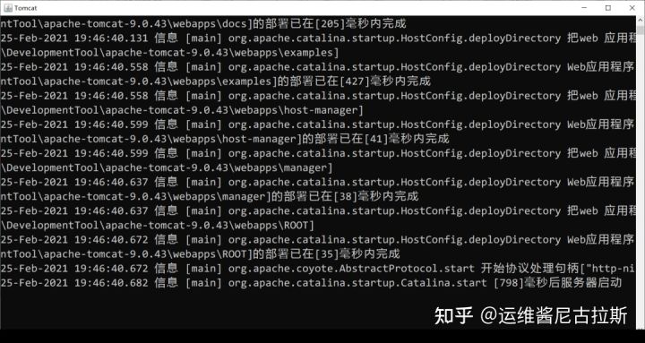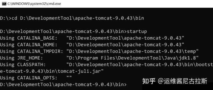 方法二:通过命令行窗口打开。cmd命令cd到.\apache-tomcat-9.0.43\bin,然后输入命令:startup,出现如下对话框,表明服务启动成功。