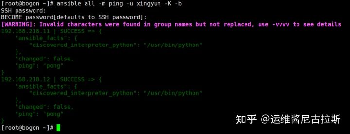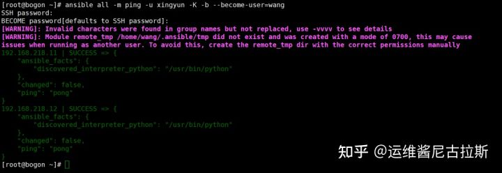 ansible all -m ping -u xingyun -K -b --become-user=wang