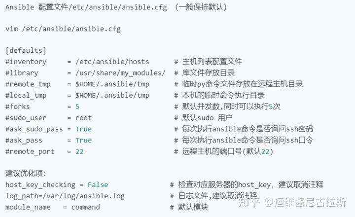 /etc/ansible/ansible.cfg 主配置文件,配置ansible工作特性(一般无需修改) /etc/ansible/hosts 主机清单(将被管理的主机放到此文件) /etc/ansible/roles/ 存放角色的目录