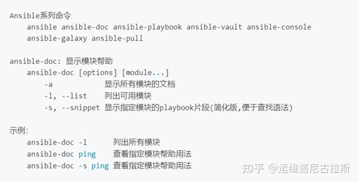/usr/bin/ansible 主程序,临时命令执行工具 /usr/bin/ansible-doc 查看配置文档,模块功能查看工具 /usr/bin/ansible-galaxy 下载/上传优秀代码或Roles模块的官网平台 /usr/bin/ansible-playbook 定制自动化任务,编排剧本工具 /usr/bin/ansible-pull 远程执行命令的工具 /usr/bin/ansible-vault 文件加密工具 /usr/bin/ansible-console 基于Console界面与用户交互的执行工具