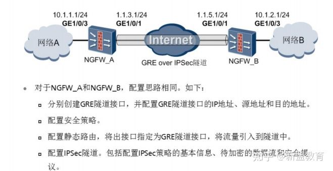 NGFW_A与NGFW_B之间建立GRE Over IPSec隧道,使网络A和网络B之间可以实现信息的加密传输。