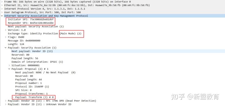 第1、2个包里重点在于ISAKMP策略的协商,这是为后面能在一个安全的环境之下协商IPSEC SA策略打下基础,因为这些策略直接提供对第二阶段的IPSEC SA策略协商的加密保护。