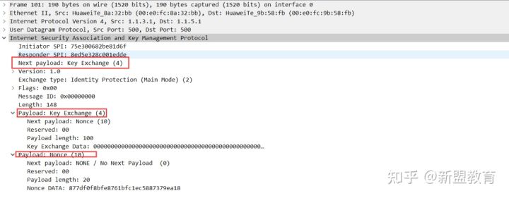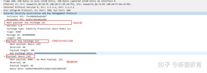 可以看到在数据包中,当前载荷类型属于密钥交换,载荷为DH公共值和Nonce随机数。都属于明文,未加密。