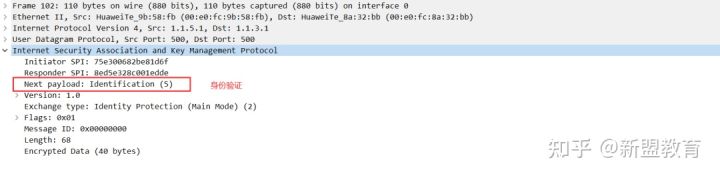 双方交换DH公共值后,结合随机数生成一系列的加密密钥,用于双方加密、校验,同时生成密钥后,将公共密钥和本端身份信息等进行hash,hash值传输给对端进行验证设备身份。发送方通过消息5发送给接收方,可以看到载荷类型为身份验证载荷,所携带的信息经过加密,无法查看相关信息。