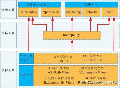 当讨论到路由策略的时候,我们经常会碰到很多种工具,比如ACL、route-policy、ip-prefix、filter-policy等等,不一一列举了。很多人都会被他们之间的调用关系搞昏了头,总感觉他们之间有说清道不明的关系。这里我们通过一张图来给大家介绍他们之间的关系。