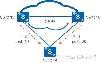 这种场景下,可以使用路由策略,将来自SwitchB这边的路由开销值调小,将来自SwitchC这边的路由开销值调大,这样流量就会自动选取SwitchB这边的链路作为主用链路,SwitchC这边的链路作为备用链路,实现路由的主备份。
