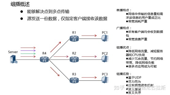 组播传输作为IP数据传输的三种方式之一 ,是指接收者的数量和位置在源端主机不知道的情况下,仅由源发出一份组播报文,向目标组播IP地址发送数据的过程。其特点有: