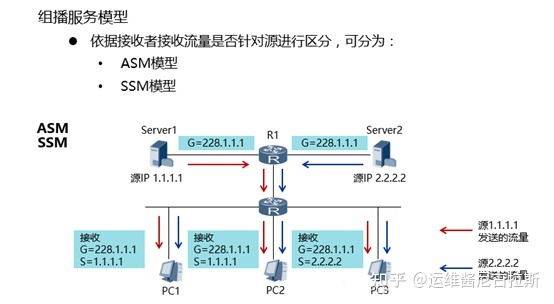 Any-Source Multicast,任意源组播。当组播组成员接收组播报文的时候,不关心是谁发送的,只要是自己所需要的组就添加进去。需要注意的是:ASM模型要求组地址必须整个组播网络中唯一。“唯一”指的是同一时刻一个ASM地址只能被一种组播应用使用。