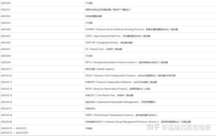 1.永久组地址:IANA为路由协议预留的组播地址(也称为保留组地址),用于标识一组特定的网络设备。永久组地址保持不变,组成员的数量可以是任意的,甚至可以为零,大部分组播地址都是永久组播地址。永久组播地址一览: