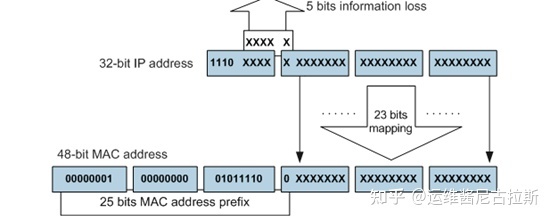 IPv4组播地址的前4位是固定的1110,对应组播MAC地址的高25位,后28位中只有23位被映射到MAC地址,因此丢失了5位的地址信息,直接结果是有32个IPv4组播地址映射到同一MAC地址上。