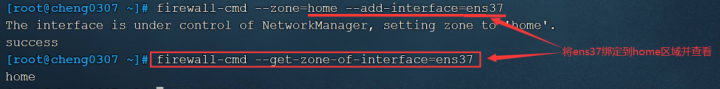 6)为指定接口ens37绑定区域homefirewall-cmd --zone=home --add-interface=ens37: