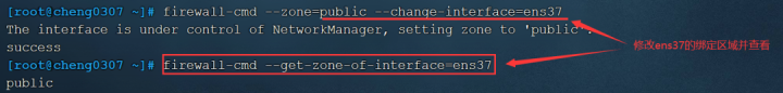 7)为指定的区域更改绑定的网络接口firewall-cmd --zone=public --change-interface=ens37: