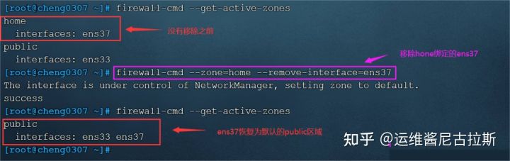 8)为指定的区域删除绑定的网络接口,这里为ens37绑定的home区域:
