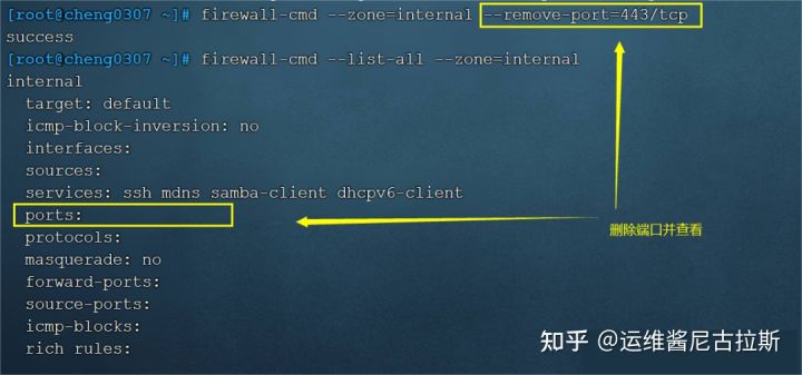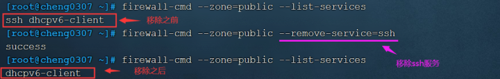 3)删除指定区域public已设置的允许访问的ssh服务firewall-cmd --zone=public --remove-service=ssh: