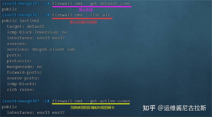 1)显示当前系统中的默认区域 、显示默认区域的所有规则和显示当前正在使用的区域及其对应的网卡接口。