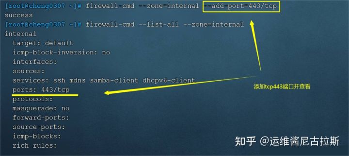 (1)允许TCP的443端口到internal区域 firewall-cmd --zone=internal --add-port=443/tcp firewall-cmd --list-all --zone=internal (2)从internal 区域将TCP的443端口移除 firewall-cmd --zone=internal --remove-port=443/tcp (3)允许UDP的2048~2050端口到默认区域 firewall-cmd --add-port=2048-2050/udp firewall-cmd --list-all