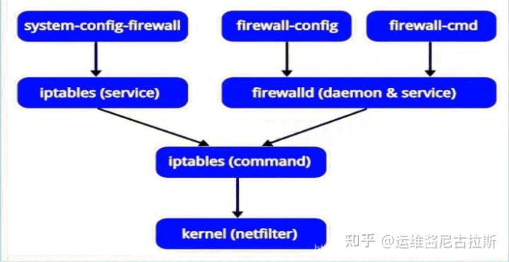 firewalld和iptables都是用来管理防火墙的工具(属于用户态)来定义防火墙的各种规则功能,内部结构都指向netfilter网络过滤子系统(属于内核态)来实现包过滤防火墙功能。