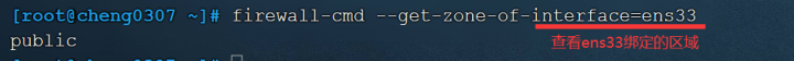 5)显示指定接口ens33绑定的区域firewall-cmd --get-zone-of-interface=ens33: