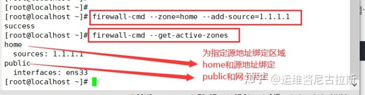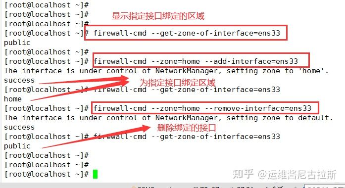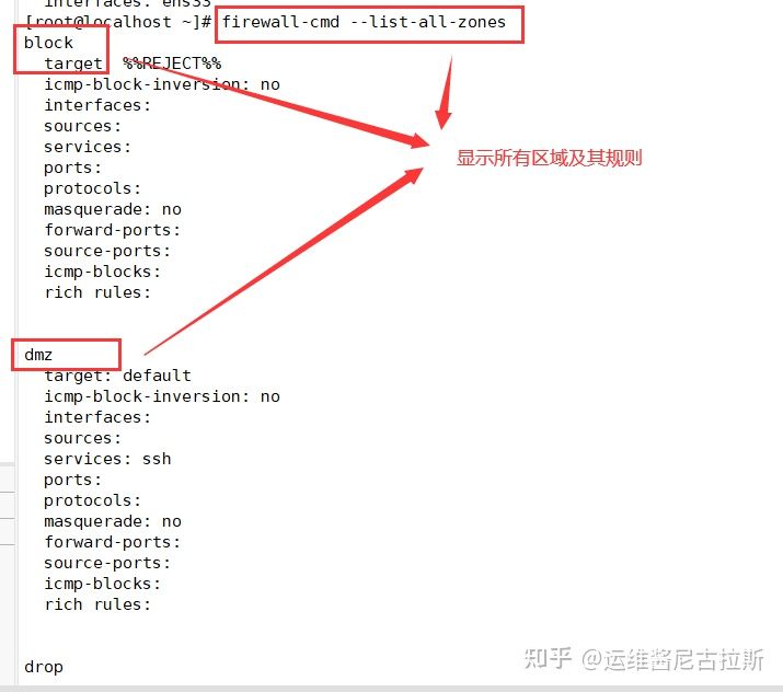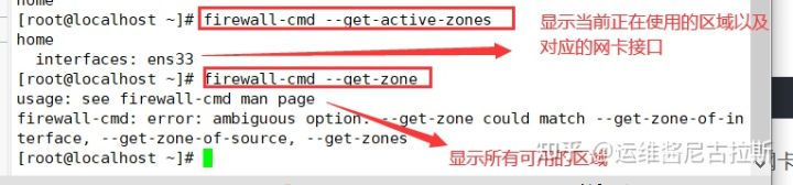 --get-default-zone :显示当前默认区域 --set-default-zone= :设置默认区域 --get-active-zones :显示当前正在使用的区域及其对应的网卡接口 --get-zones :显示所有可用的区域 --get-zone-of-interface= :显示指定接口绑定的区域 --zone= --add-interface= :为指定接口绑定区域 --zone= --change-interface= :为指定的区域更改绑定的网络接口 --zone= --remove-interface= :为指定的区域删除绑定的网络接口 --list-all-zones :显示所有区域及其规则 [--zone=] --list-all :显示所有指定区域的所有规则,省略--zone=时表示仅对默认区域操作 [--zone=] --list-services :显示指定区域内允许访问的所有服务 [--zone=] --add-service= :为指定区域设置允许访问的某项服务 [--zone=] --remove-service= :删除指定区域已设置的允许访问的某项服务 [--zone=] --list-ports :显示指定区域内允许访问的所有端口号 [--zone=] --add-port=[-]/ :为指定区域 设置允许访问的某个/某段端口号(包括协议名) [--zone=] --remove-port=[-]/ :删除指定区域已设置的允许访问的端口号(包括协议名) [--zone=] --list-icmp-blocks :显示指定区域内拒绝访问的所有 ICMP 类型 [--zone=] --add-icmp-block= :为指定区域设置拒绝访问的某项 ICMP 类型 [--zone=] --remove-icmp-block= :删除指定区域已设置的拒绝访问的某项ICMP类型 firewall-cmd --get-icmptypes :显示所有 ICMP 类型
