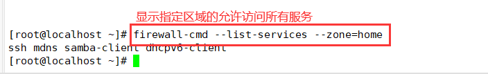 4.home(家庭区域):允许与ssh、ipp-client、mdns、samba-client或dhcpv6-client预定义服务匹配的传入流量,其余均拒绝。