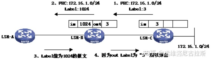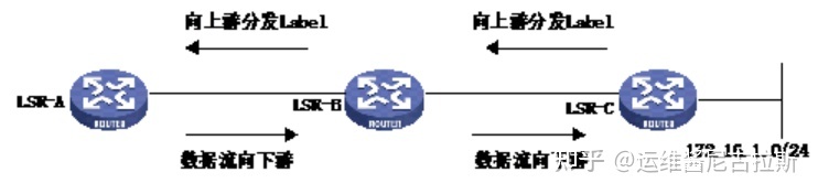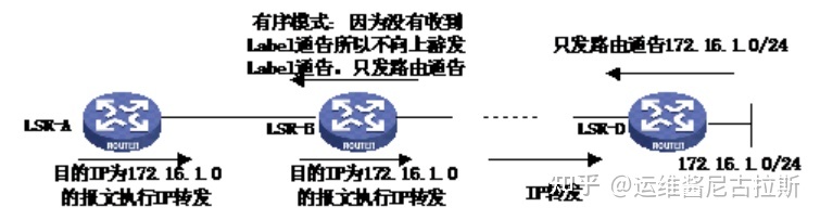 如果LSR-A收到目的IP为172.16.1.0/24的报文将采用传统IP转发。可以看出,在有序控制方式下,是否向上游LSR分发标签取决于自己是否收到下游LSR的标签。