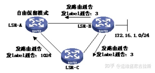 在上图中LSR-A工作于自由保留方式,对于FEC为172.16.1.0/24将生成下一跳为LSR-B的LSP,LSR-C发来的Label通告将保留。如LSR-A和LSR-B之间的直连链路down掉,对于FEC:172.16.1.0/24的将很快生成下一跳为LSR-C的LSP。