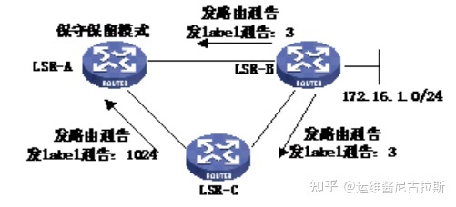 工作于保守保留模式的LSR收到无效的Label通告后将不存放到标签绑定表里,在向上游通告Label时可以自由使用这些标签。保守保留模式的缺点是对拓扑变化的响应较慢,优点是节省标签。