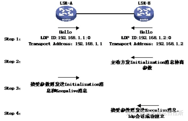 Step 1 :互发Hello消息,Hello消息中包括LDP-ID和Transport Address。双方将用Transport Address建立LDP会话,收到Hello消息后再进一步比较Transport Address确定由谁作为主动方发起TCP连接。